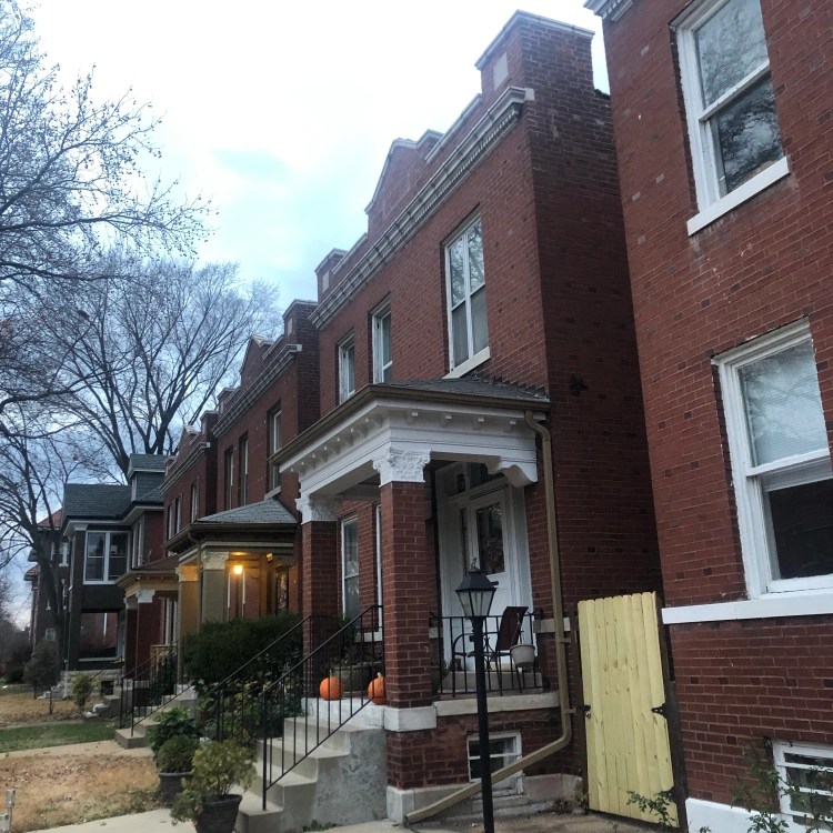 Following the 1904 World’s Fair, Skinker DeBaliviere turned from farmland to a dense urban neighborhood. For more on the broader neighborhood history, consider reading Celebrating Skinker DeBaliviere – it is as fine a neighborhood history as I’ve ever read. By 1912 in the southeastern corner of the neighborhood, an R.O. Brown Real Estate Company applied for building permits at 5765-67-69-71 Pershing Avenue. At that time, prior to World War I and the anti-German sentiment that would accompany the conflict, the street was still named Berlin Avenue. There is some likelihood that R.O. Brown was Reasor-Brown, a prominent home builder in the area during the early 20th century. The company built middle to upper class housing throughout St. Louis’ west end and out into county suburbs including Clayton. The permits were for $12,000 (roughly $370,000 today adjusted for inflation). All four buildings were to be brick single family homes at two stories tall. As one can witness in the present day, the four detached rowhomes are nearly identical save for stylistic differences in the paint schemes.