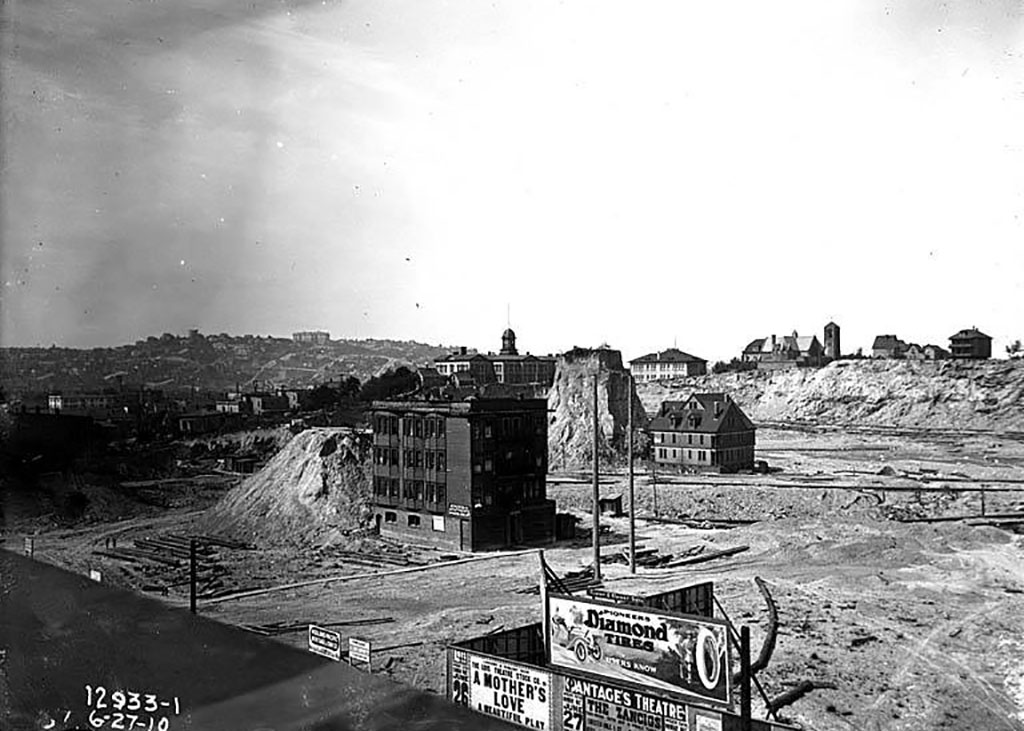By the late 1920s, subsequent rounds of the Denny Regrade had finally reached the church. In 1929, the church was demolished as part of the regrade. Along with the church, a convent and school were also razed. When you see buildings like this from the former Denny Hill, it makes you wonder if it was worth the trouble to displace so many residents and businesses to flatten the land. City Engineer R.H. Thompson certainly thought so, but it would take nearly a century before Amazon’s capitalist rise would realize the vision of the regrade. This poem published showed how parishioners felt about the loss of their beloved church: “The hill whereon you, martyred, stand / Is soon to melt away / Before the onward march of trade / God of this newer day.”